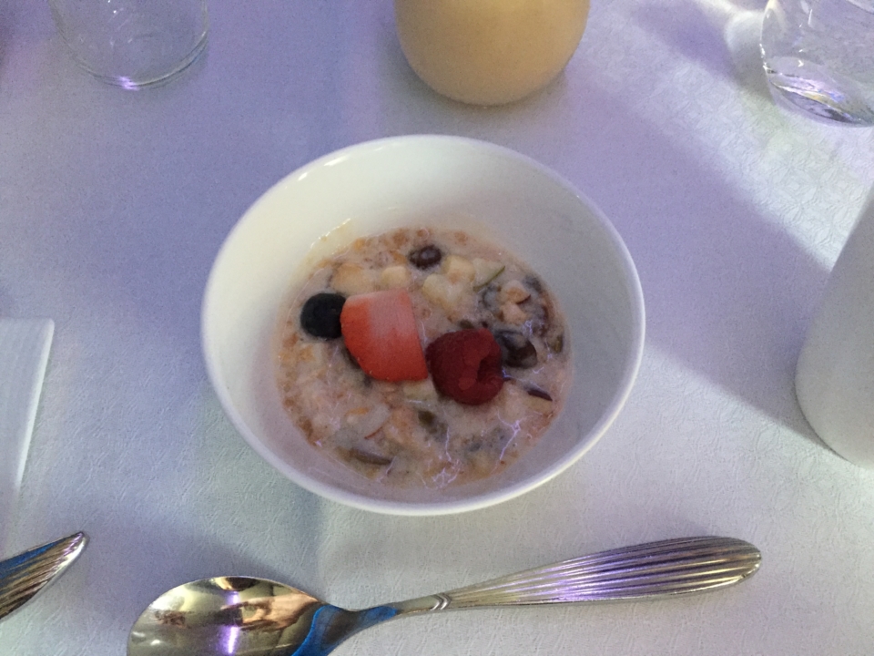 Before long, breakfast services had commenced. The table was set, and I ordered a delicious mango, fig and oat smoothie to start. I also got a carrot, ginger and aloe vera juice.