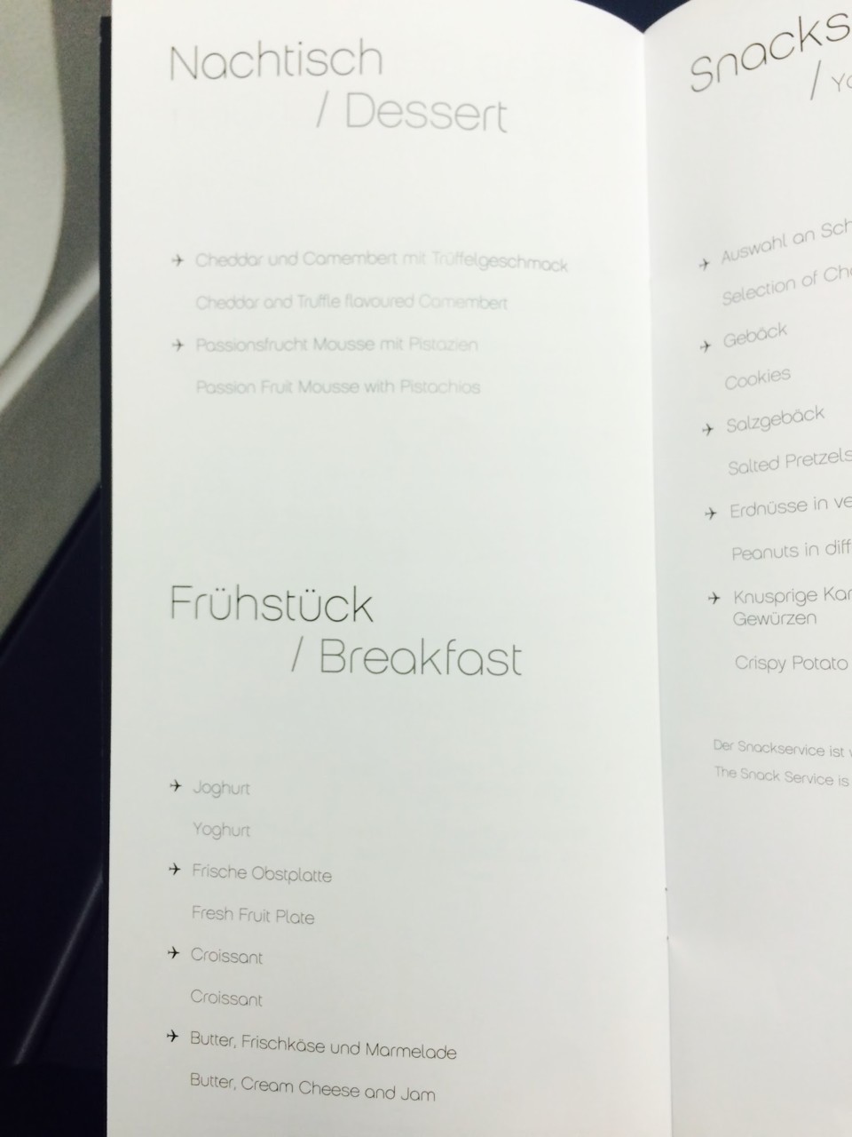 There’s no bedding offered on AirBerlin, but the pillow is of a good size and the blanket was comfortable. I was able to fall asleep easily and woke up on my own about 4.5 hours later, as we were passing over Amsterdam. Despite me waking up rather late, the flight attendant had a tray of breakfast for me ready to go, so I had a couple of bites of that.