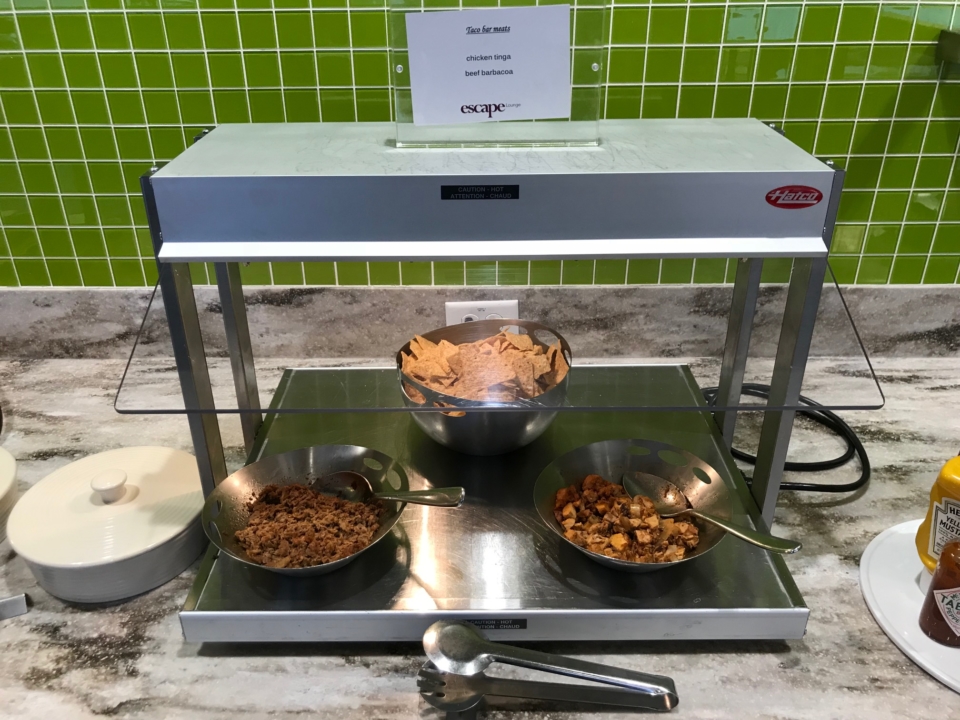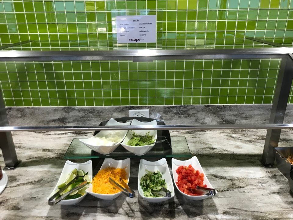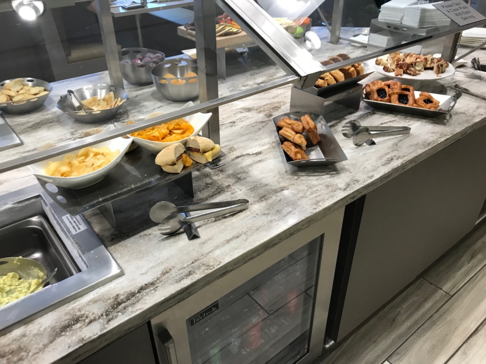 There was a salad bar that didn’t have your standard, boring DIY items: this one had chopped cucumbers, marinated olives, teriyaki mushrooms, banana peppers, pico-de-gallo, cubed cucumbers and grated carrots. There were tons of pastries as well as hot sammies (as they say in Minnesota) with panini ingredients. Like, when could you ever get a Cubano at an airline lounge, unless you’re ordering it at one of the AA Flagship lounges at JFK or the United Polaris lounge?