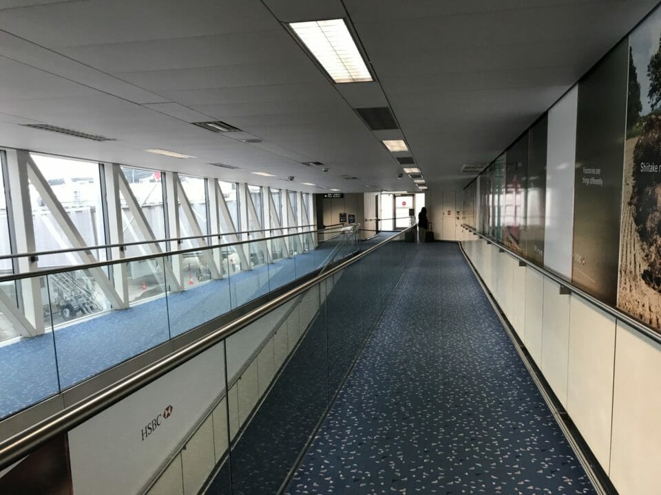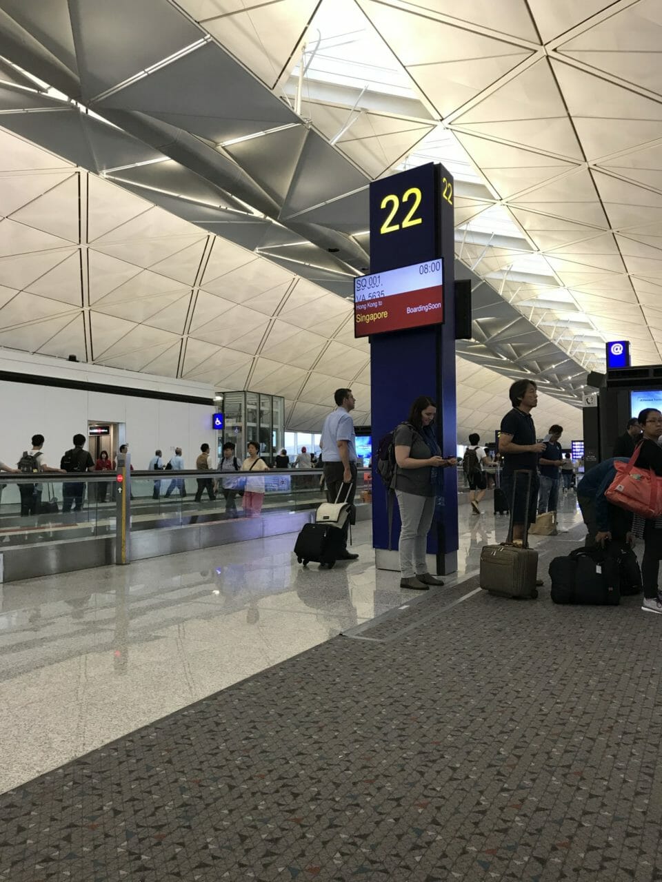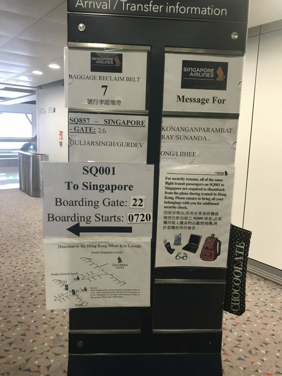 We had a really long taxi-way into our gate at Hong Kong airport and we were told that we had to take all of our belongings and disembark if we were traveling to Singapore on the onward connection. After deplaning, we were given the transit cards, as well as a Singapore Airlines sticker, and had to go through a relatively painless security check.